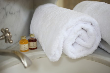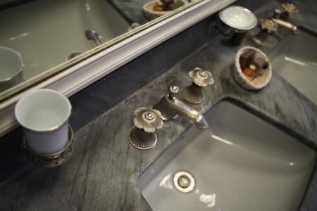 Suite prestigieuse située au rez-de-chaussée du Château. Salle de bain en marbre gris. Vue sur le parc.